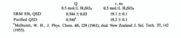 365.0 nm,Eobs=6920±10L-mol-cm-1 用兩種方法測定了該材料的含水量,卡爾-費舍爾法測定6次的平均值為(4.74±0.05)%,而重量損失法測定的4次平均值為(4.57±0.04%)。二水奎寧中水的理論值為4.60%。將SRM 936的光子產(chǎn)率Q和熒光壽命T與二水合物精制硫酸奎寧的光餅值進(jìn)行了比較,總結(jié)如下: