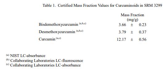 表 1 和表 2 提供了 SRM 3299 中姜黃素和元素的認(rèn)證質(zhì)量分?jǐn)?shù)值,以干質(zhì)量為基礎(chǔ)報(bào)告。NIST 認(rèn)證值是 NIST 對其準(zhǔn)確度有最高置信度的值因?yàn)樗幸阎蚩梢傻钠妬碓炊家驯徽{(diào)查或采取考慮[1]。價(jià)值分配分析由 NIST 和合作實(shí)驗(yàn)室進(jìn)行。認(rèn)證值計(jì)算為 NIST 方法平均值的未加權(quán)平均值和合作實(shí)驗(yàn)室平均值的加權(quán)中值(在適當(dāng)?shù)那闆r下)。相關(guān)的不確定性以大約 95% 的置信水平表示 [2-4]。