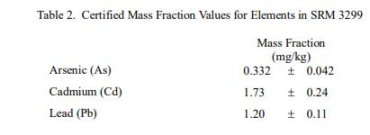水分測定:SRM 3299 的水分含量在 NIST 通過 (1) 冷凍干燥 7 天至恒重進(jìn)行測定; (2) 用高氯酸鎂在干燥器中室溫干燥28 d; (3)在80℃的強(qiáng)制通風(fēng)烘箱中干燥2h。對所有三種技術(shù)的平均值進(jìn)行平均,以確定每克接收質(zhì)量的 (0.9146 ± 0.0060) 克干質(zhì)量比例;此值上顯示的不確定性是擴(kuò)展的不確定性,代表 95 % 的置信水平。用于將數(shù)據(jù)從原樣轉(zhuǎn)換為干質(zhì)量基礎(chǔ)的轉(zhuǎn)換因子是干質(zhì)量比例的倒數(shù),即原樣數(shù)據(jù)除以 0.9146 以確定干質(zhì)量結(jié)果。從水分測量中獲得的轉(zhuǎn)換因子的相對不確定度為 0.3%,并包含在本證書中提供的認(rèn)證值的不確定度中,以干重為基礎(chǔ)報(bào)告。