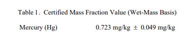 表 1 中提供了汞的認證值,表示為基于濕質量(原樣)的質量分數 [1]。該值基于使用冷蒸汽的主要方法進行的分析同位素稀釋電感耦合等離子體質譜 (CV-ID-ICP-MS) [2,3]。 NIST 認證值是 NIST 對其準確性具有最高置信度的值,因為所有已知或可疑的偏差來源都已被調查或考慮 [4]。認證值的不確定度以擴展不確定度的形式給出,以大約 95% 的置信度覆蓋被測量。擴展不確定度計算為 U = kuc,其中 uc 是與 ISO/JCGM 指南 [5] 一致的組合標準不確定度,k 是覆蓋因子,(k = 2) 對應于大約 95% 的置信度。被測量是汞的總質量分數。