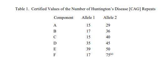 表 1 列出了每個成分的 [CAG] 重復(fù)次數(shù)的認(rèn)證值。這些認(rèn)證值是通過 Sanger 測序技術(shù)計算組成等位基因中 [CAG] 重復(fù)單元的數(shù)量來確定的,并通過片段分析(基因分型)確認(rèn)。獨立的正向和反向測序和片段分析結(jié)果之間的完全一致提供了對規(guī)定整數(shù)計數(shù)的最高置信度。探索了其他技術(shù),沒有理由懷疑這些結(jié)果。 NIST 認(rèn)證值是 NIST 對其準(zhǔn)確性有最高置信度的值,因為所有已知或可疑的偏差來源都已調(diào)查。這CAG 重復(fù)次數(shù)的認(rèn)證值可追溯到 SI 計數(shù)單位 (1)。