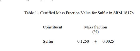 SRM 1617b 硫含量的認證值在表 1 中以質量分數 [2] 的形式報告。NIST 認證值是 NIST 對其準確性有最高置信度的值,因為所有已知的或懷疑的偏倚來源已被調查或考慮 [3]。認證值是根據 NIST 和合作實驗室使用儀器測試方法進行的分析結果對真實值的當前最佳估計。