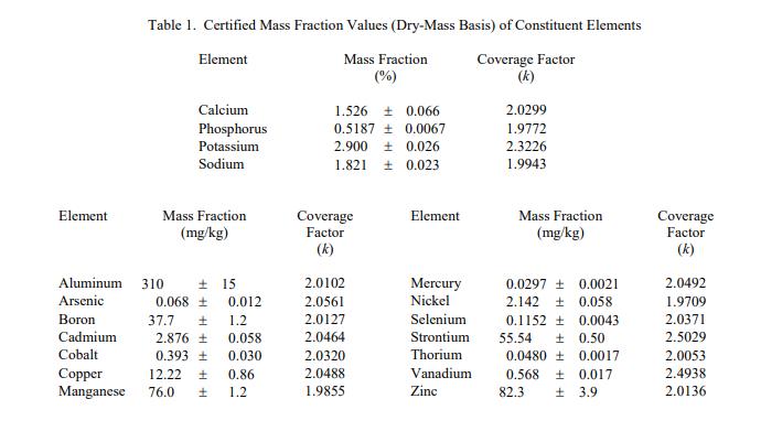 表 1 中提供了以干質量為基礎報告的選定組成元素的認證質量分數(shù)值。NIST 認證值是 NIST 對其準確性有最高置信度的值,在所有已知或已調(diào)查或考慮了可疑的偏見來源帳戶 [1]。