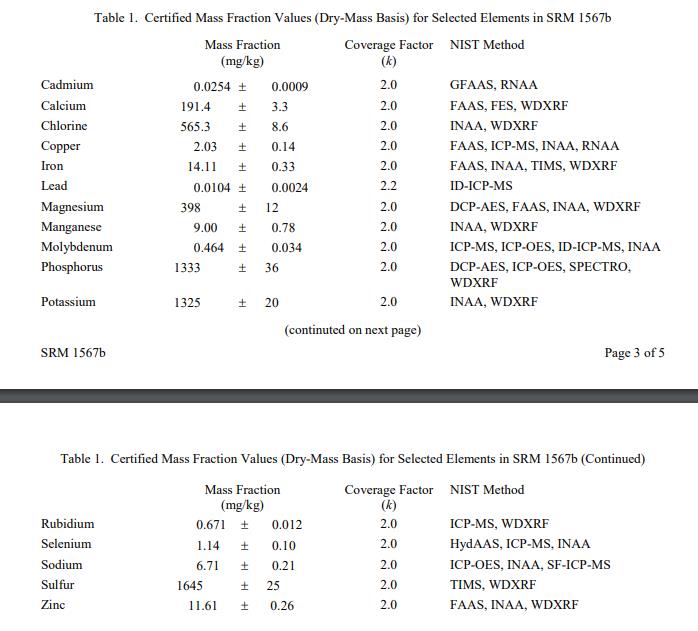 表 1 提供了 SRM 1567b 中選定元素的認(rèn)證質(zhì)量分?jǐn)?shù)值。 NIST 認(rèn)證值是 NIST 對其準(zhǔn)確性的最高置信度的值,因?yàn)樗幸阎蚩梢傻钠顏碓炊家颜{(diào)查或考慮[1]。以質(zhì)量分?jǐn)?shù)單位 [2] 以干質(zhì)量為基礎(chǔ)報(bào)告值。