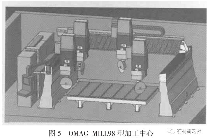 由于有關(guān)技術(shù)和關(guān)鍵的問題還未得到完全徹底解決,故在國內(nèi)石材加工中還沒得到廣泛應(yīng)用,也顯著提高了石材制品的加工效率。圖5為意大利OMAG公司的MILL98型加工中心工作模擬圖,該加工中心同時配備了4個工作頭。