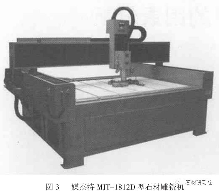 圖3為國產(chǎn)美杰特MJT-1812D型石材雕銑機主 要用于墓碑加工,其最大加工尺寸為:寬2700mm、 長2100mm、高1800mm,最大加工質(zhì)量為: 1500kg。
