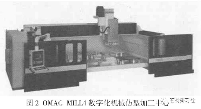 圖2為意大利0MAG公 司MLL4型3到6軸的數(shù)字化機械仿型加工中心, 這套加工中心集鋸、雕刻、打磨、轉(zhuǎn)銑于一體。