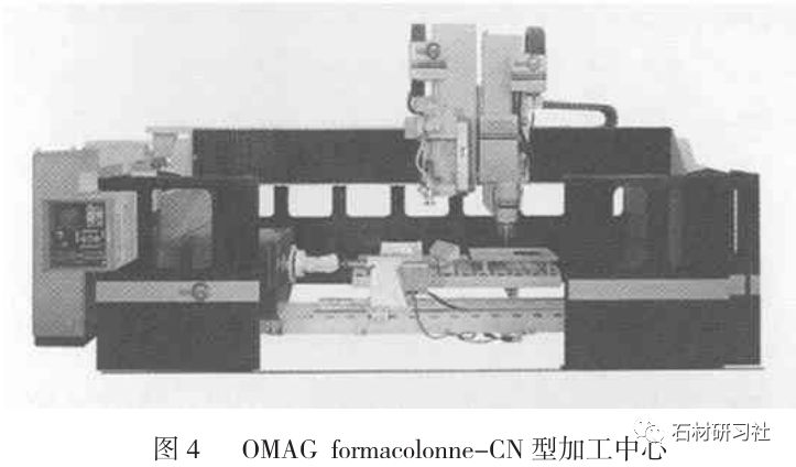 圖4 為意大利OMAG公司設(shè)計的formacolonne--CN型加工中心,該加工中心采用4軸聯(lián)動數(shù)字控制加工技術(shù), 同時配有兩個工作頭。
